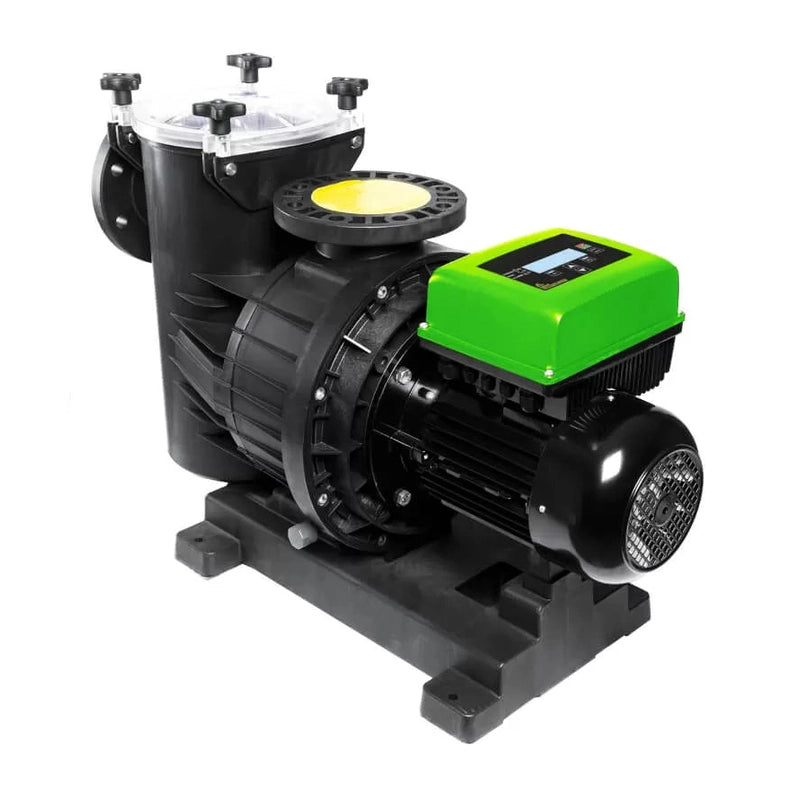 Bomba centrífuga autocebante de alto caudal para grandes piscinas, parques acuáticos y aplicaciones industriales. Cuerpo en polipropileno reforzado con fibra de vidrio, eje AISI 431, protección IP55.