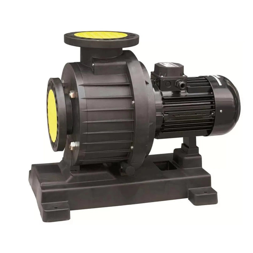 Bomba centrífuga autocebante de alto caudal para piscinas olímpicas, parques acuáticos y aplicaciones industriales. Cuerpo en polipropileno reforzado con fibra de vidrio, eje AISI 431, protección IP55.